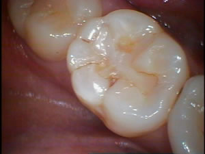 左の健康で削られていなかった歯の溝ですら虫歯になるのですから、人工的な接着剤でつけられた修復物も再度虫歯になってもしょうがない事かもしれません。