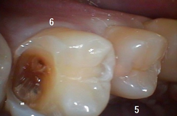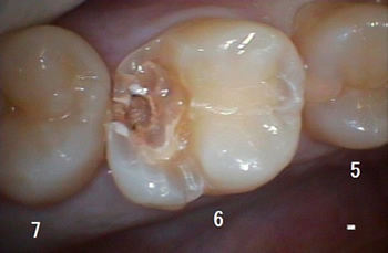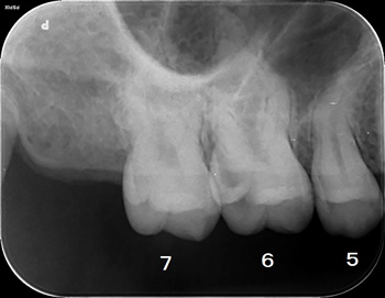 表面的には「白っぽく」なっているだけでしたが、レントゲンで確認すると、6番目の歯は「かなり大きな虫歯」で歯髄(歯の神経)にギリギリかもです!