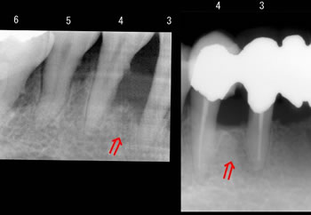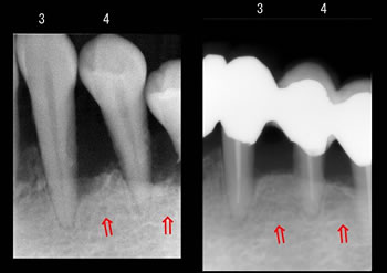左の方は骨の縁がモヤモヤっと虫に喰われてみたいにぼんやりしてますが、右の治療後は再生されたうえに歯槽硬線がハッキリ見え、かなり安定しています! |
