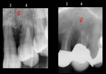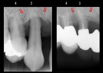 お口の中の同じ部位で「左が初診時」で「右が再生治療後」のレントゲンです! |