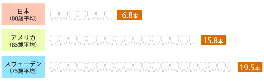 これが欧米諸国との間に大きな差がついてしまった最大の原因です。スウェーデンでは75歳の平均で約20本も歯が残っているのです。私たちもきちんとしたことを行えば、十分歯を残せるのです。 |