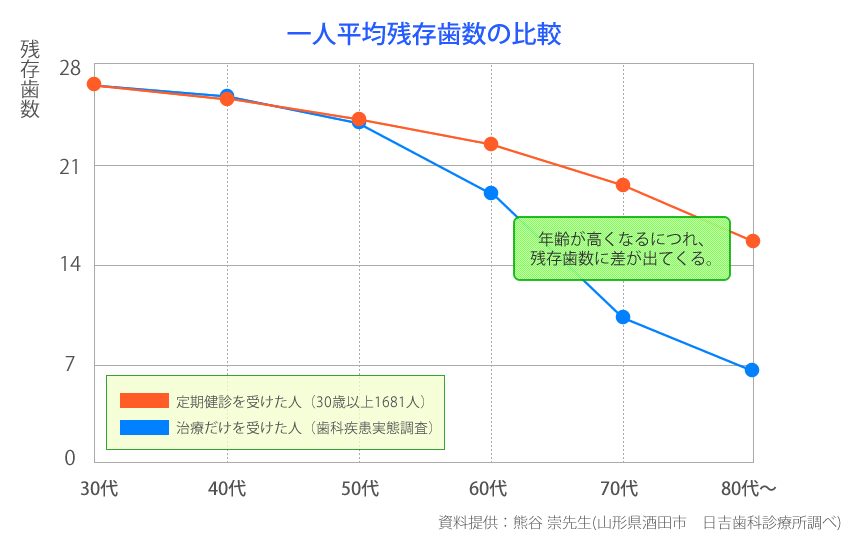 日本でも、熊谷崇先生の調査によると、以下のグラフのようにメンテナンスをしっかり受けた方と受けなかった方とでは80歳になったときに約9本もの差がついています。